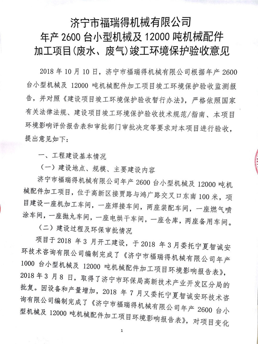 濟(jì)寧市福瑞得機(jī)械有限公司年產(chǎn)2600臺小型機(jī)械及12000噸機(jī)械配件加工項(xiàng)目(廢氣、廢水)竣工環(huán)境保護(hù)驗(yàn)收意見