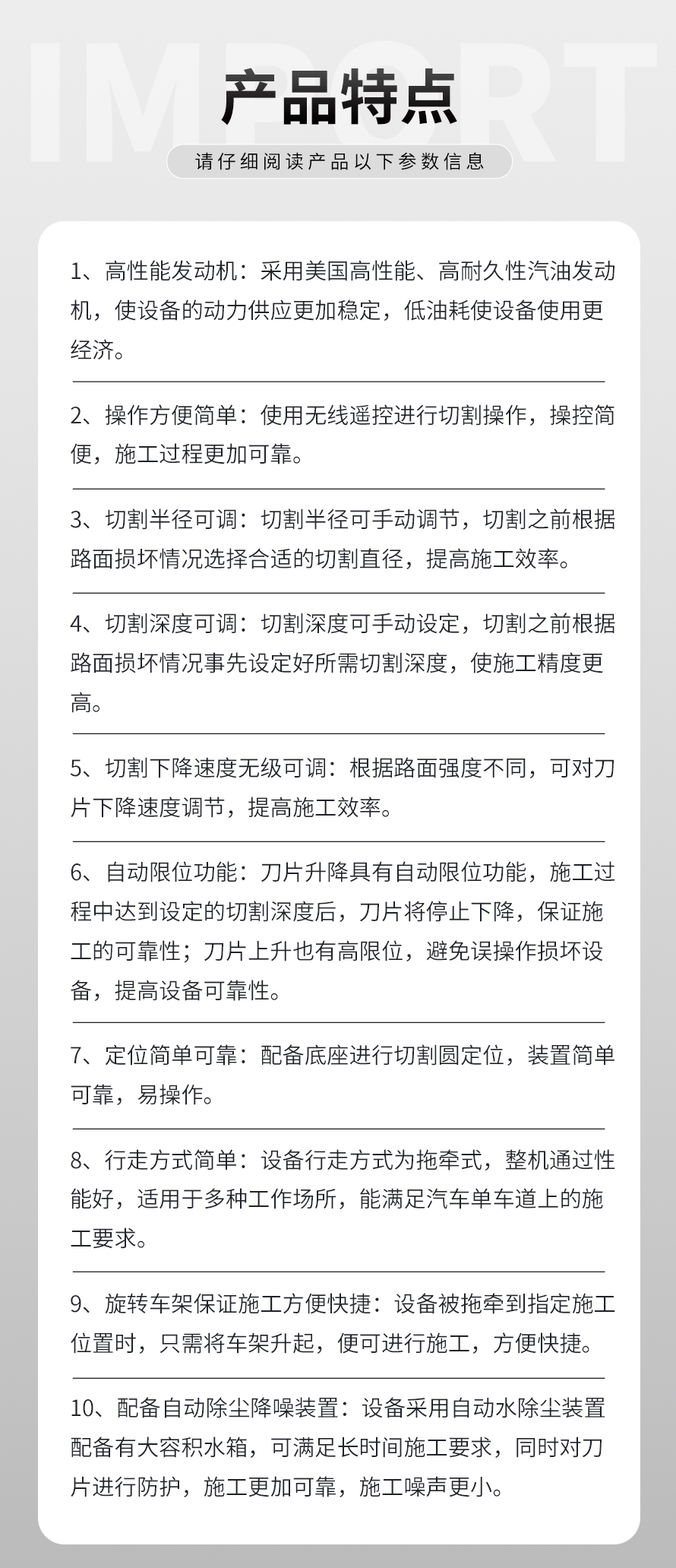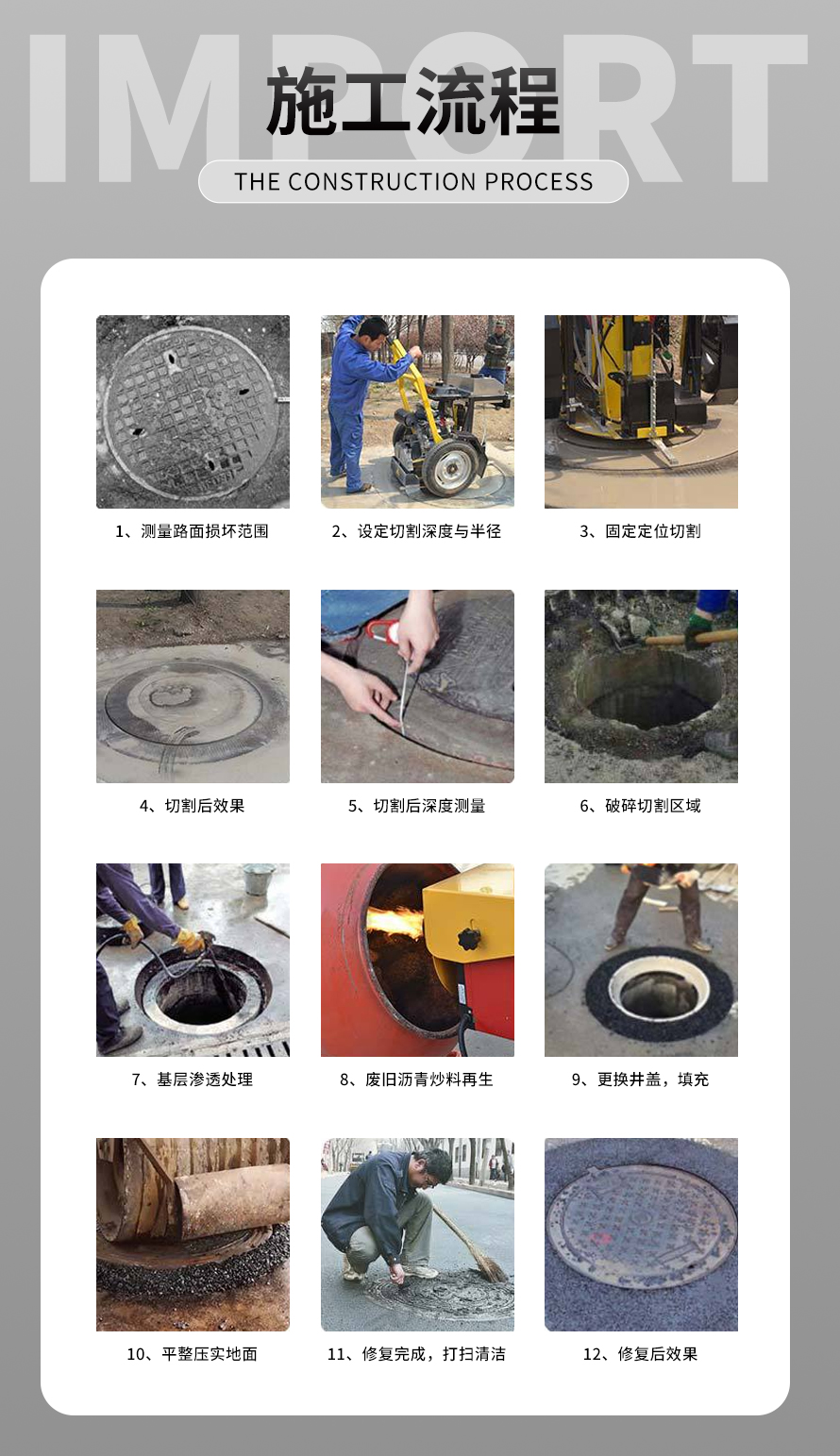 專門用于對城市道路中機動車道等井蓋周圍的水泥混凝土或瀝青路面進(jìn)行圓形切割。為清楚井蓋周圍的破損路面提供分割區(qū)域,修復(fù)后的地面美觀,延長了路面的使用壽命。