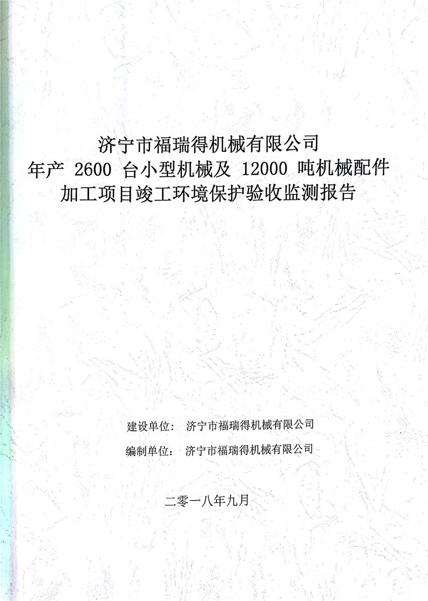 濟寧市福瑞得機械有限公司年產2600臺小型機械及12000噸機械配件加工項目(廢氣、廢水)竣