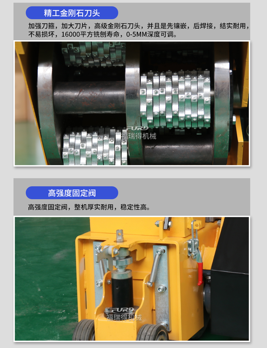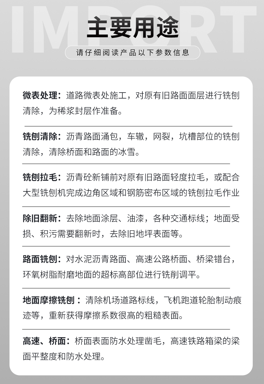 用于橋面鋪設(shè)瀝青或車間舊的混凝土地面重新攤鋪混凝土之前,清除水泥浮漿以及鏟平拉毛, 也用于清除建筑施工中的堅(jiān)硬灰渣。