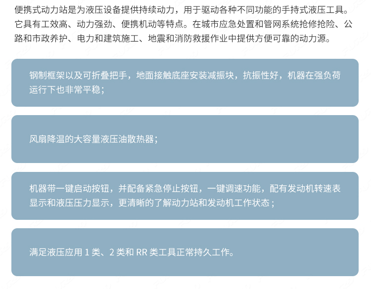 適用于路面搶修、道路施工、市政維護(hù)、保養(yǎng)、園林等工作場(chǎng)景 ;.設(shè)備安裝便捷,搬運(yùn)簡(jiǎn)便,適應(yīng)性強(qiáng),可輕松解決破碎、切削、分裂、打樁、壓實(shí)等施工項(xiàng)目。